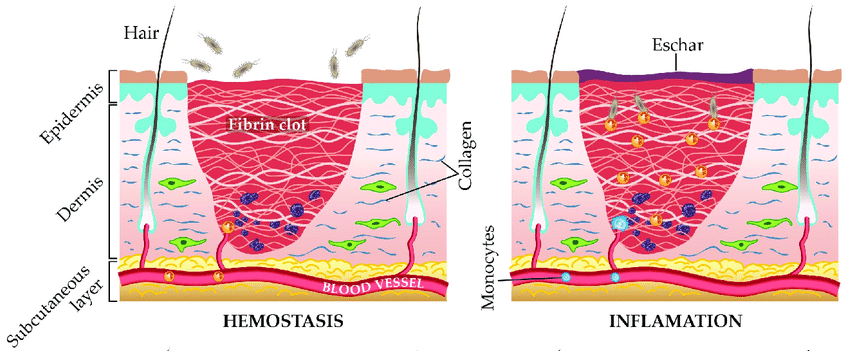 For a small wound it bled a surpring amount, but having applied pressure and dressings to my partner’s finger, haemostatic processes began immediately and successfully produced a clot. In a fresh wound microvascular injury leads to extravasation of blood into the wound and initiates the coagulation cascade. There is constriction of vessel walls; and the resulting clot formation and platelet aggregation limits further blood loss. The platelets trapped in the clot are essential, not only for haemostasis but also for a normal inflammatory response, as they release pro-inflammatory cytokines and growth factors. These proteins attract and activate fibroblasts, endothelial cells and macrophages and amplify the response by activating the complement and kinin cascades.