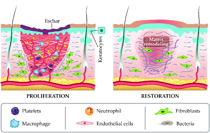 As days passed my partner and I watched the raw surface of the wound start to dull as epithelial proliferation established a new protective layer of nascent skin. At first fragile, it gradually gained strength as fibroblasts laid down collagen. In the proliferative phase of wound healing a provisional matrix is established over which re-epithelialisation can progress. In the dermis at this time, fibroblasts and endothelial cells are the most prominent cell types and support capillary growth, collagen formation, and the generation of granulation tissue. Within the wound bed, fibroblasts produce collagen as well as glycosaminoglycans and proteoglycans, which are major components of the extracellular matrix.