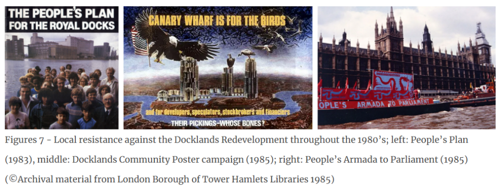 The history of development of the docklands is fascinating and provides a stark but unsurprising example of the power of money to exclude and marginalise local communities. The Museum of London Docklands has a great exhibition including protest art from the 80s when the Docklands Community proposed a People’s Plan for regeneration. They were consistently and systematically excluded and ignored.