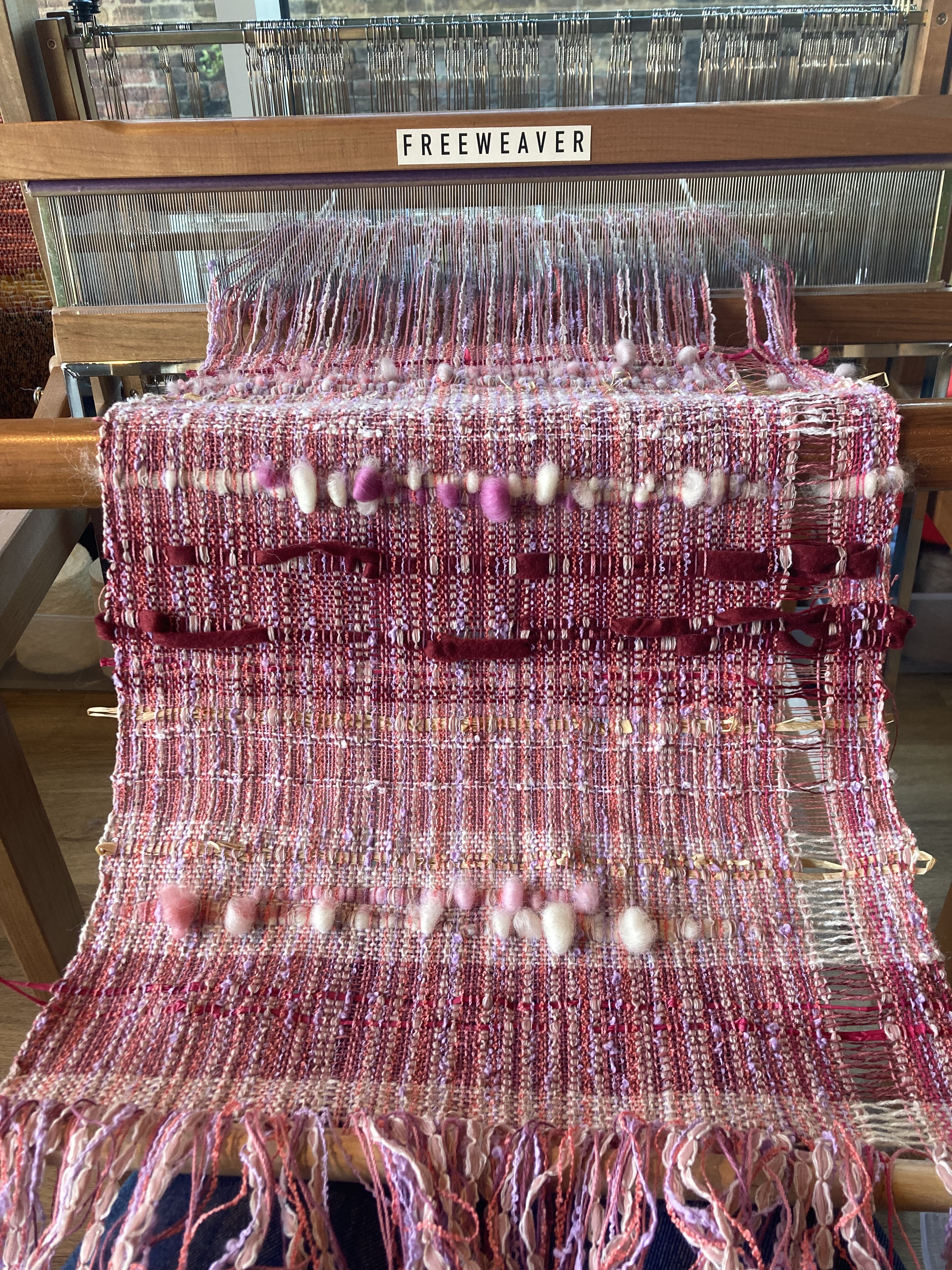 I worked Good Friday, but had a three day weekend, and on Saturday went to the weaving open studio. I wove a wall hanging for my Mum, using a warp inspired by the cherry blossom, incorporating felt and raffia. I haven’t been on the loom since before I left for Kilimanjaro. It was great to be back.